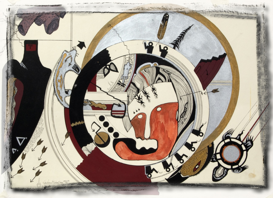 During the journey of having the sacred pipe blessed, we were broken down for some hours while our brakes were being repaired. While sitting there, a young Navajo man and I talked about ceremonial singing. he told me a good ceremonial song is made from in front of the teeth. he also noted that most modern people speak and sing from behind their teet. I found the observation remarkable and later made this paing about the idea.