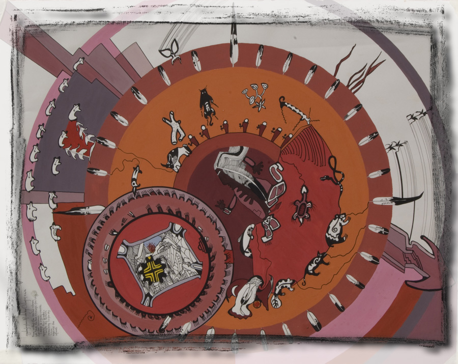 This painting is about the long ceremonial blessing made for this sacred pipe before it ever arrived in Connecticut. It is one of two, before and after. This one is before. Each Eagle feather represents a blessing, purification ceremony. The animals and plants represent the tribal clans who participated. These includ the ancient fish clan, eagle clan, bear clan, turtle clan, beaver clan, buffalo clan, spider clan, one earring clan, root clan, snake clan, and butterfly clans, for example.