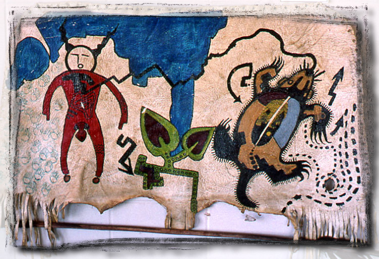 A painting on brain tanned deer hide about the passing of the sacred from one generation to the next.